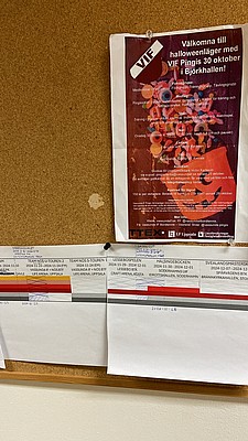 Halloweenläger i Björkhallen onsdag 30 oktober 2024Bild: Björkhallen den 30 oktober 2024 med ledare Victor, deltagare i träning och lek, en tom pingishall efter lägret och en affisch som inbjudan finns på. Foto: Elis Låås och Victor Karlsson/VIF BT